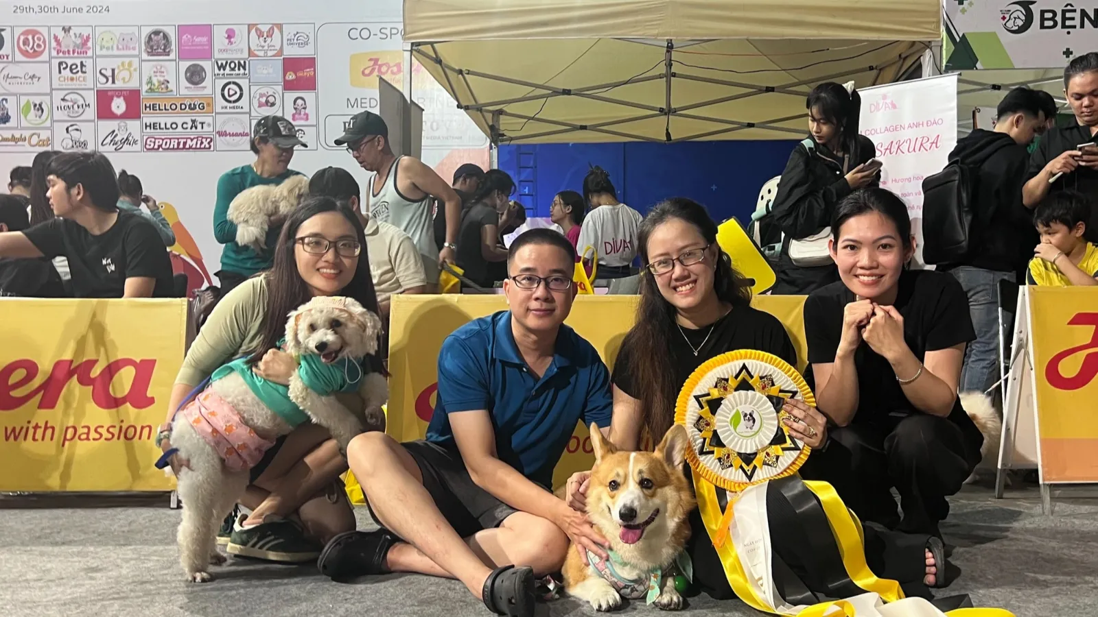 Gia đình chị Đức Hạnh (Q.Bình Thạnh) hộ tống chú chó cưng đến tham gia cuộc thi chó và vỡ oà khi giành được giải chó Corgi đực đẹp nhất. "Đây là lần đầu tiên tôi dẫn chó tham gia ngày hội, không khí hôm nay rất đông vui. Tôi xem chó cưng như một thành viên trong gia đình nên chăm sóc và dành nhiều yêu thương", chị Hạnh chia sẻ.