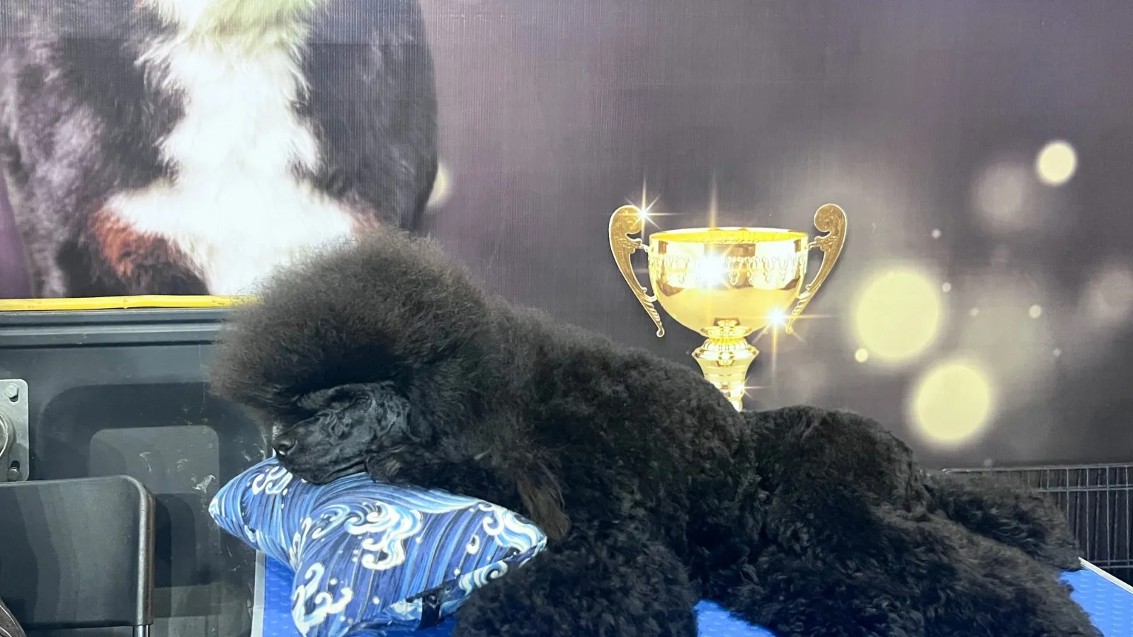 Một chú chó Poodle đang nghỉ ngơi sau khi tham dự Dog show. Ông Đoàn Minh Thuận, đại diện BTC ngày hội thú cưng chia sẻ: "Đây là sự kiện cộng đồng tiên phong và giữ được sự duy trì tại Việt Nam từ năm 2018 đến nay. Mỗi năm đều có sự phát triển về quy mô tổ chức, nội dung chương trình và số lượng người tham gia".